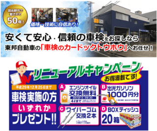 こんばんは! 習志野市で愛されて50年!安くて安心・信頼の車検の「車検のカードックトウホウ」です。 只今リニューアルキャンペーンとして「平成29年12月25日ま…